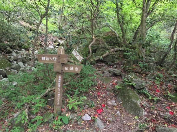 難所ヶ滝の分岐点です。滝を見に行ったら、また降りて戻ってこないといけないので遠回りになりますが、せっかくここまで来たので滝を見に行くことにしました。(実際は、ここに戻らなくてもよい、険しいけれどショートカットできる道があるようです)